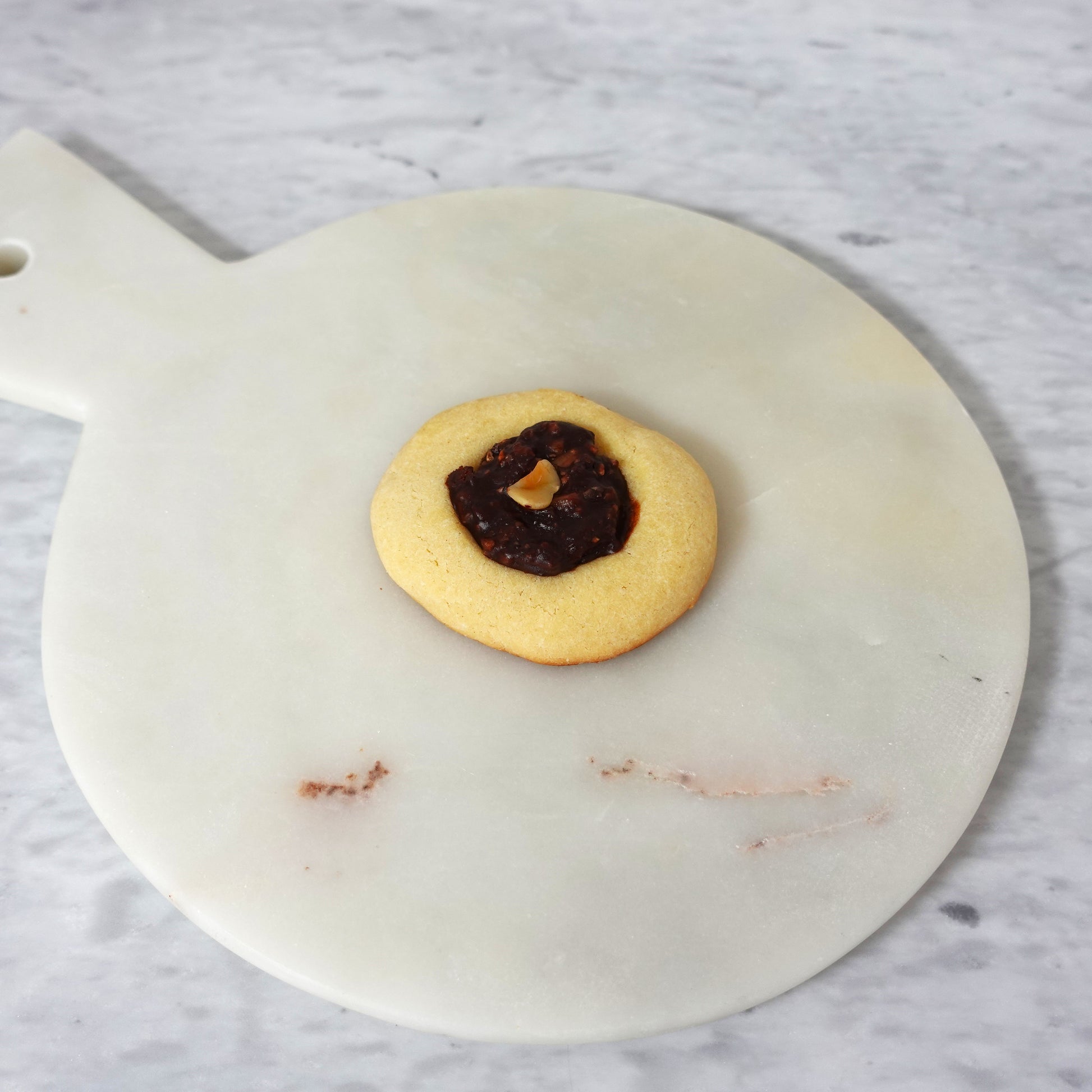 Middle Eastern-inspired cookie with a decadent chocolate-date filling, sprinkled with hazelnuts in a dimpled center.