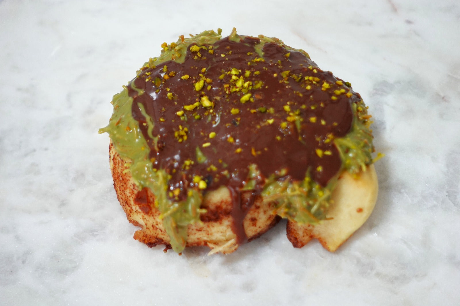 Cinammon Roll topped with a pistachio-tahini mix, crispy kunafa, melted chocolate, & crushed pistachios